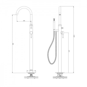 - длина излива: 24,3 см; - высота излива: 98 см; - полная высота смесителя: 112 см; - латунная душевая лейка с 1-ой функцией; - держатель для лейки с защитным вкладышем; - душевой шланг в оболочке ПВХ, длина: 150 см.