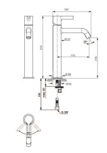 JOY Однорукоятковый смеситель для раковины Vessel, керамический картридж 28 мм, с функцией HWTC (ограничение максимальной температуры горячей воды), без функции CLICK, логотип Ideal Standard на корпусе, металлическая рукоятка без индикаторов горячей / холодной воды, аэратор Caché M16,5x1 с ограничением потока 5 л/мин, система монтажа EASY-FIX (облегченный монтаж), гибкая подводка G3/8" PEX.