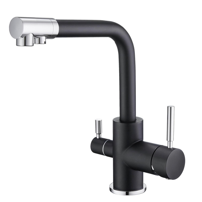 Кухонный смеситель с возможностью подключения фильтра для очистки воды. Фильтрованная вода подается отдельной ручкой через отдельную трубку и не смешивается с водопроводной водой. Однорычажное управление поможет легко регулировать температуру и напор подачи воды. Соответствует стандартам DIN DVGW.